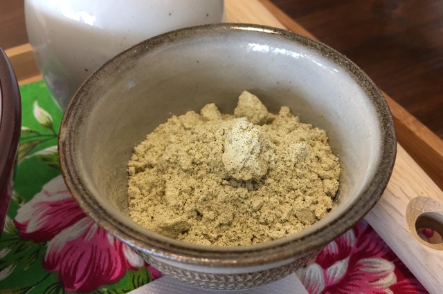 黒豆・ハトムギ・黒ごま・白ごま・蓮の実・赤米・山芋など複数の穀物を粉末にした擂茶(れいちゃ)にお湯を注いで頂く客家伝統の食べるお茶。