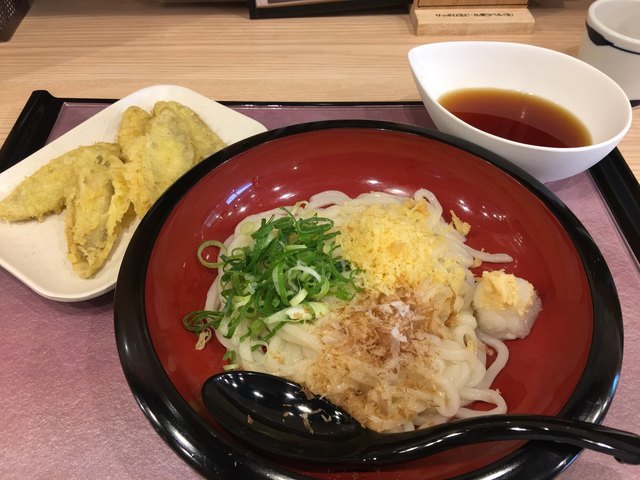 もっちりちゅるちゅる喉越しの美味しいうどんは大根おろしに天かす・鰹節・ネギ。