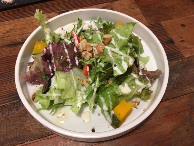 葉物以外にパプリカ・かぼちゃ・ブラックオリーブ・くるみと盛りだくさん。