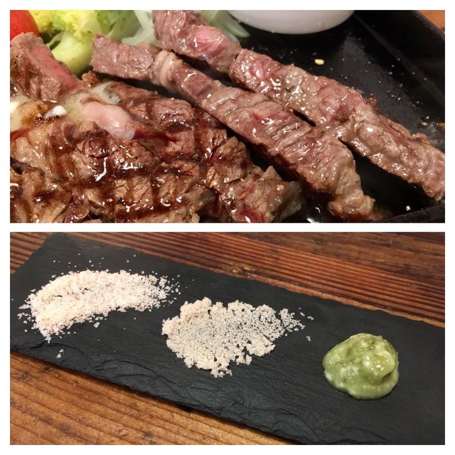 ソースの他にお塩2種でピンク岩塩・淡路島の藻塩と薬味でわさびが添えられています。