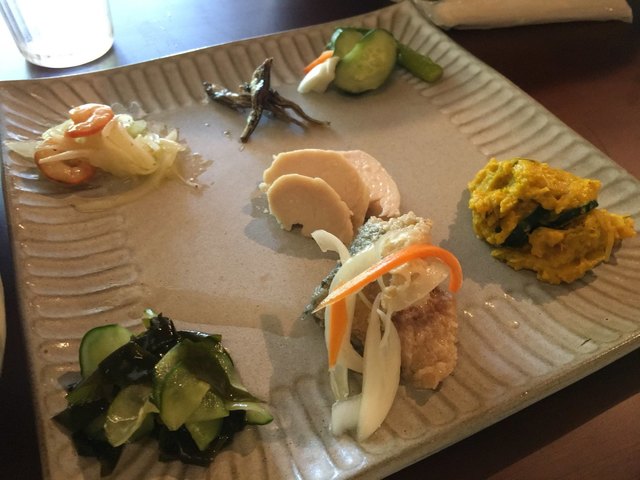 海老と新玉ねぎのマリネ・いりこの佃煮・糠漬け・鶏むね肉の冷製・わかめときゅうりの酢物・鯵の南蛮漬け・かぼちゃサラダ