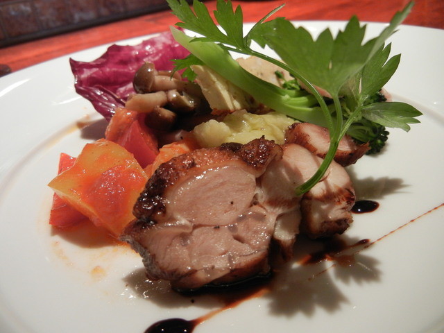 私のメインは鴨で、コロッコロの状態で出てきました。このボリュームはテンションが上がります。しかも脂ノリノリのこの分厚い皮。このこんがりとカリッと焼かれた皮にはガツンと塩がきいていて、思わず笑みが出る最高の美味しさでした。