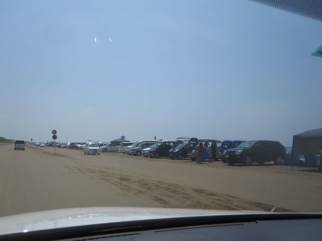 浜辺に沿って車がとまってる