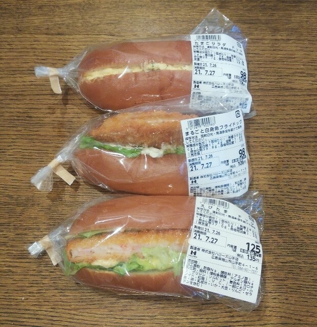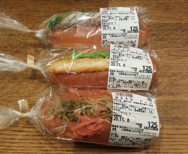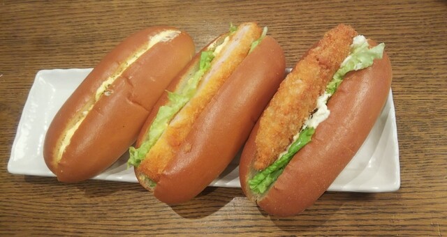 -1735- 合鴨ロースドッグ、えびたまドッグ、焼きそばドッグ食パン購入でちょうど500円です