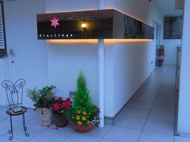 店内の中央には花瓶と枝木が飾られ、その奥に、モダンなお庭がある。