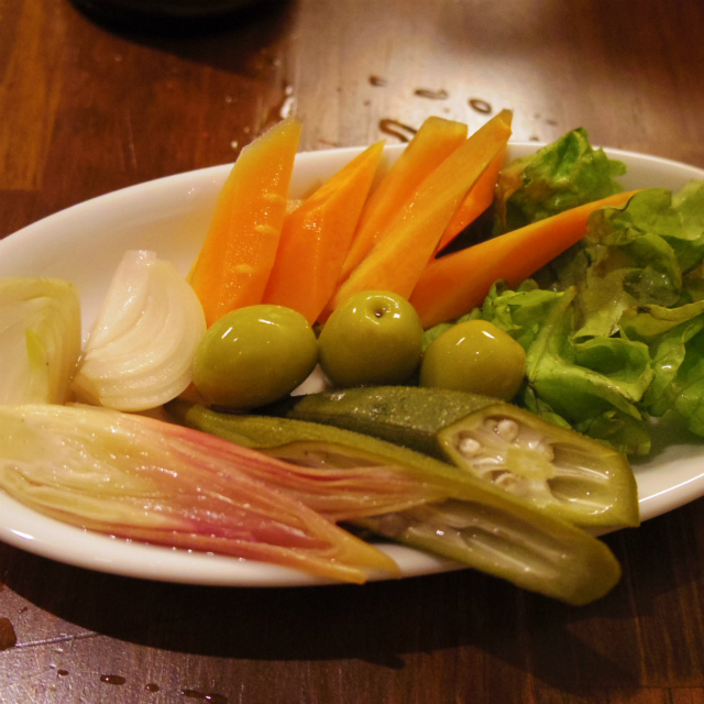 ピクルスはそれほど酸味が強くなく、若干甘めかな。みょうが、おくら、にんじん、オリーブ、ミニ玉ねぎ?