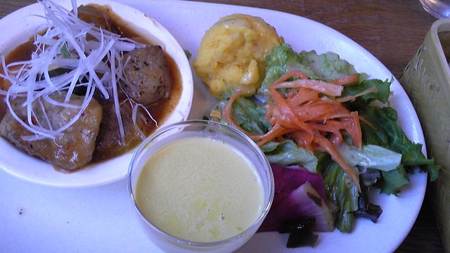 メインは鶏のポン酢風味で、さつまいものうす切りのフライがぱりぱりして美味しかったです。もちろん鶏も。