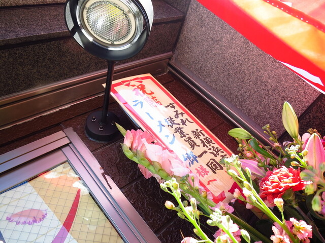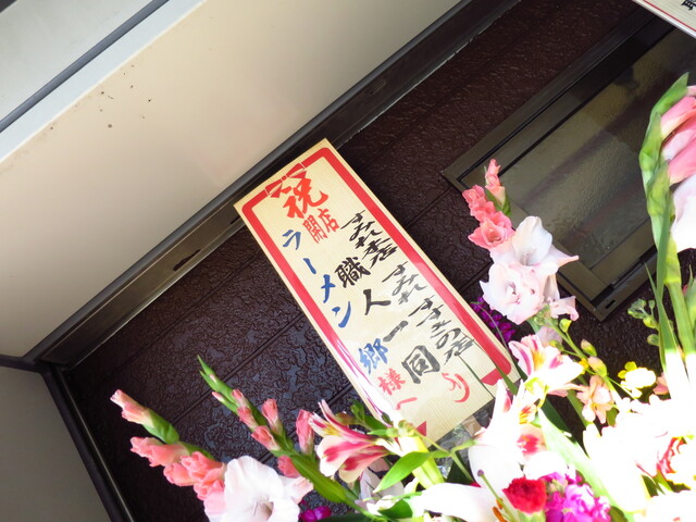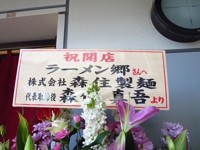 店前には村中社長を筆頭にすみれラーメン博物館店、大島、森住製麺などからの花輪。