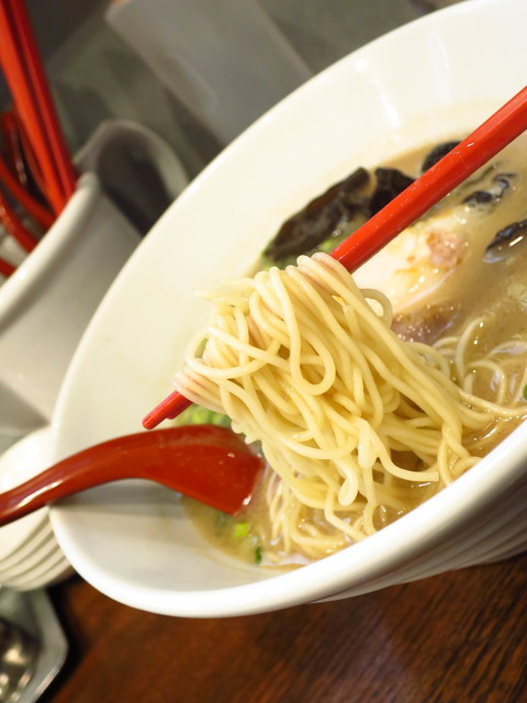 麺は文句のつけどころがない王道の博多極細ストレート麺だが、