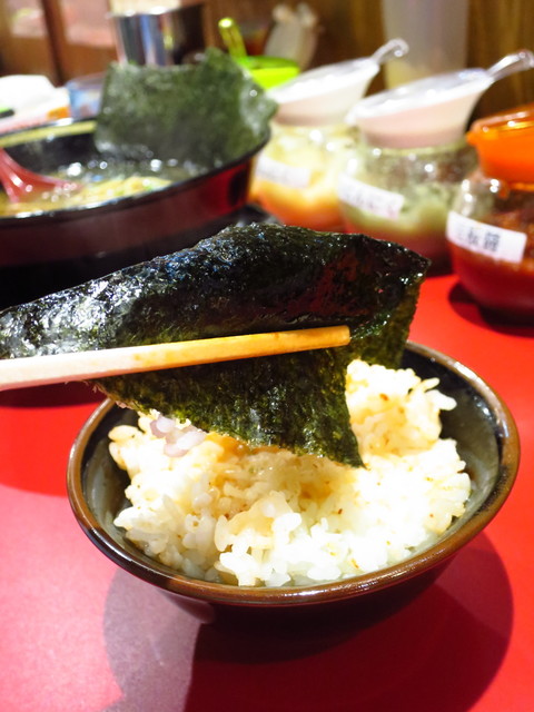 王道の白メシの上にブラックペッパー、ニンニク、豆板醤乗せの海苔巻きライスのほうが