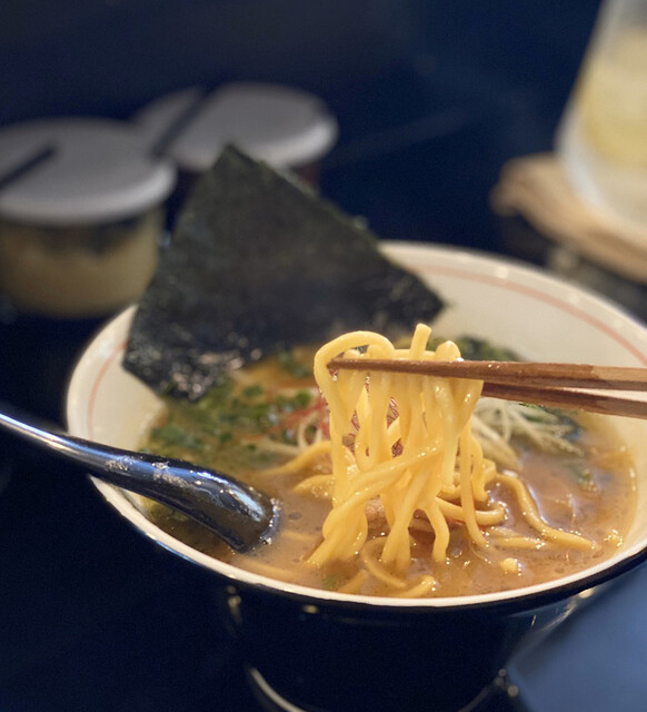 また、麺に関しては「飯島製麺」使用のこのド豚骨醤油スープに負けない力強さを持つ。