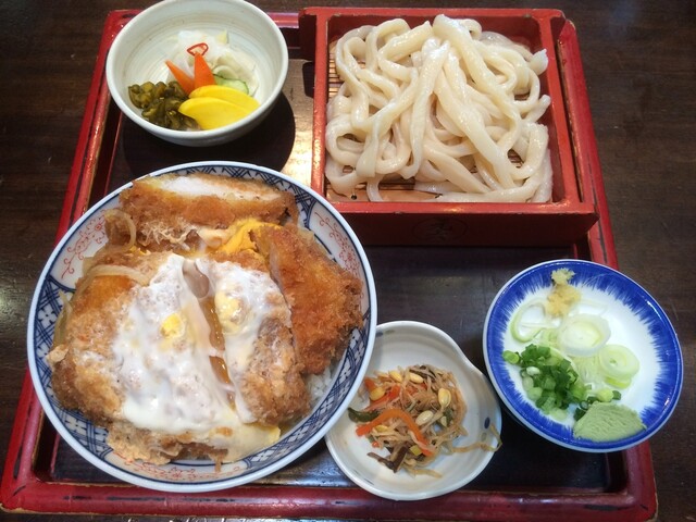 メニューは、うどんの他にどんぶり物も充実していて、目移りがしてしまいます。カレーうどんも良いし、武蔵野うどんといえば肉汁うどんを食べてみないとと想いを巡らしましたが、好物のカツ丼に冷やしうどんが付いたセットにしました。