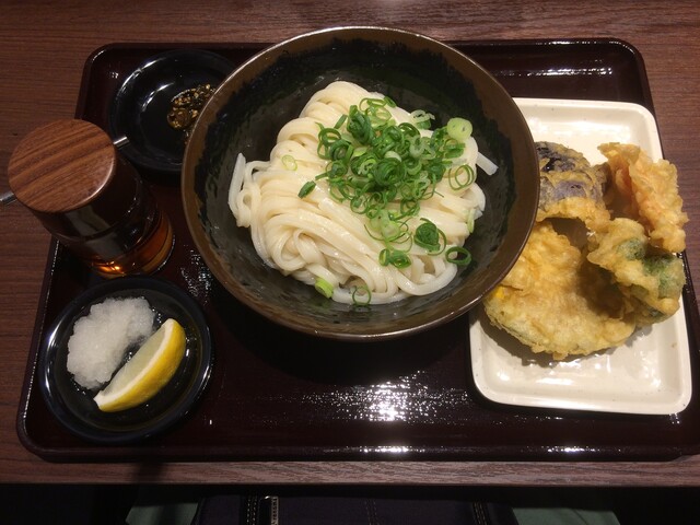 うどんは、薄口のかけ醤油を後からかけるタイプですが、これは出汁ではと見間違うくらい色が薄いです。ネギと大根おろしは乗っていましたが、これに生姜とたまりで漬け込んだ唐辛子を加えると結構な辛さになりました。野菜店が揚げたてでは無く油が回りつつあったので、付け合わせのレモンのさっぱり感が中和してくれました。