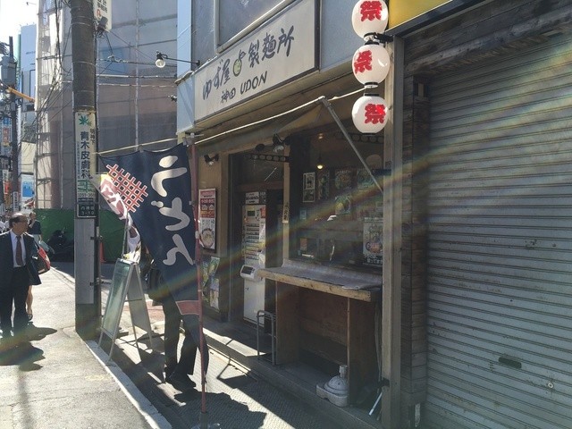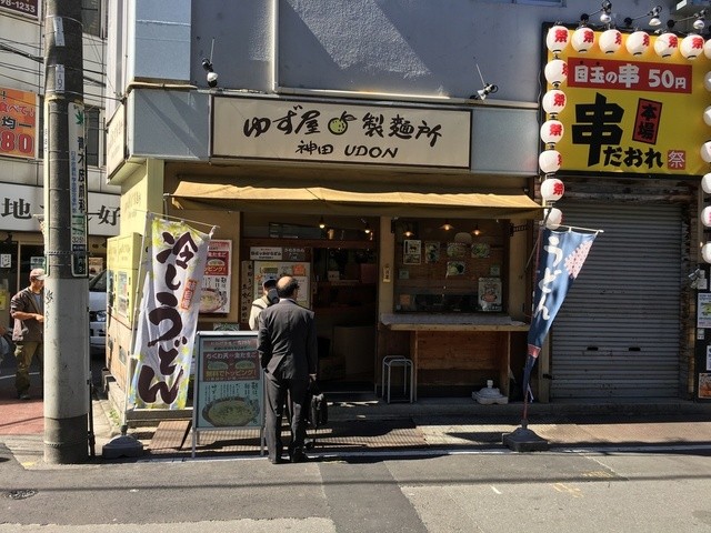 東京でスタンドうどんを語る上で、ここを外す訳にはいかないと思ったほどである。神田駅界隈にはサラリーマンのための飲食店が密集しており、美味しい店がたくさんある。この「ゆず屋製麺所」は神田駅の線路沿いにある10人入れない小さな店である。さっぱりとした大根おろしとかき揚げが食べたかったが、券売機でその組み合わせが無かったので、柚子おろしうどん390円にかき揚げ150円を付けることにした。券を店員さんに渡すと、生卵かちくわ天がサービスで付くとのこと。ちくわ天があるのであれば、かき揚げ入らなかったと後悔した。