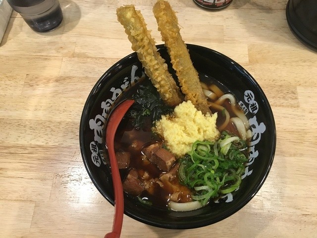 麺は、九州のうどんにしてはしっかりしています。讃岐や武蔵野ほどのコシはありませんが、柔らかいとこの汁に合わないのでしょうね。うどんとそばが選べるようになっていたので、うどんありきたりの大したことない麺かと思っていましたが、このジャンキーな雰囲気に合っています。