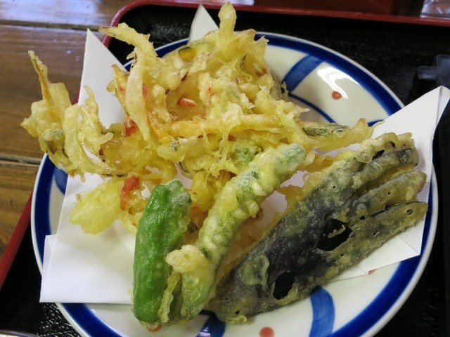 天麩羅は茄子、インゲン、南瓜、掻き上げ、小さいピーマン?(辛くない獅子唐かも)。海老などが付かないのは値段が安いので仕方がないかな。
