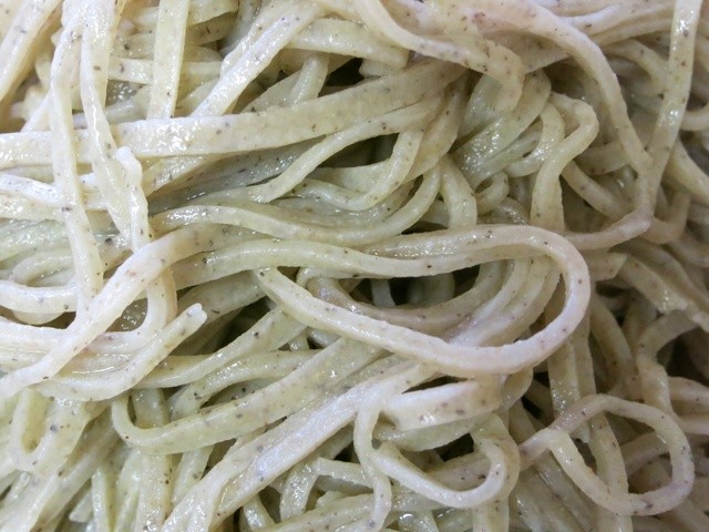 蕎麦はほんのり緑色が入っていて色が濃く、星が散る田舎蕎麦風。野趣あふれる蕎麦で力強い印象。若干薄切りだがしっかりエッジが立っていた。食べると茹で加減は少しだけ硬め。コシは強いと言うほどでは無いが、ソコソコ感じてなかなかバランスが良かった。