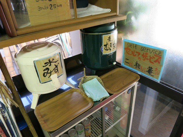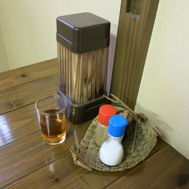 おしぽり無し、ティッシュあり。お冷や(麦茶)は出してくれたが、お代わりは店内にサーバーがあってセルフ。店内に灰皿は無し。入り口脇に灰皿あり。聞いたら外で喫ってくれとの事で、煙草を吸わない自分には嬉しい配慮です。