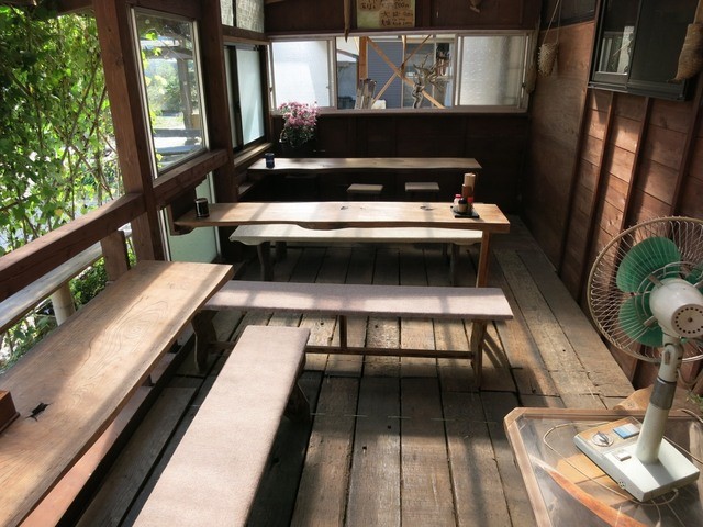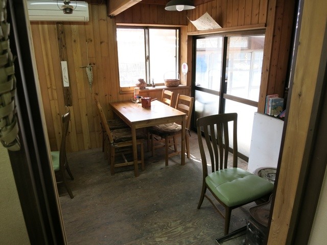 店はのどかな山里の畑の中に建っていて、入り口の左横を見るとテラス席があった。入り口を入ると左手に長い店内。回れ左をすると先ずは長いテーブル席。右側に厨房。正面奥の部屋にテーブル席。