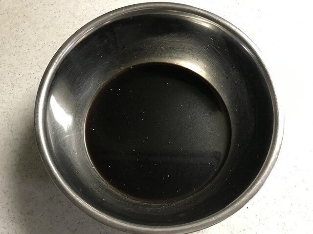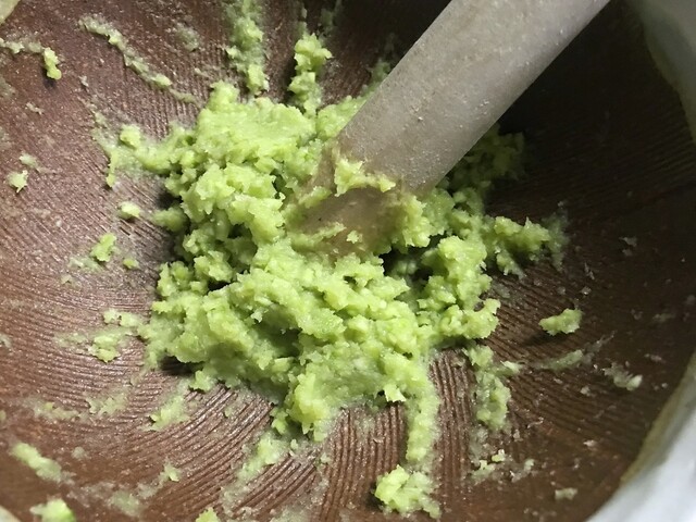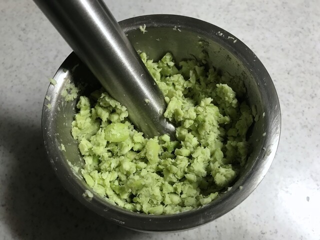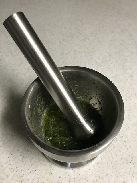 ステンレスすり鉢でパクチーと黒砂糖を潰します