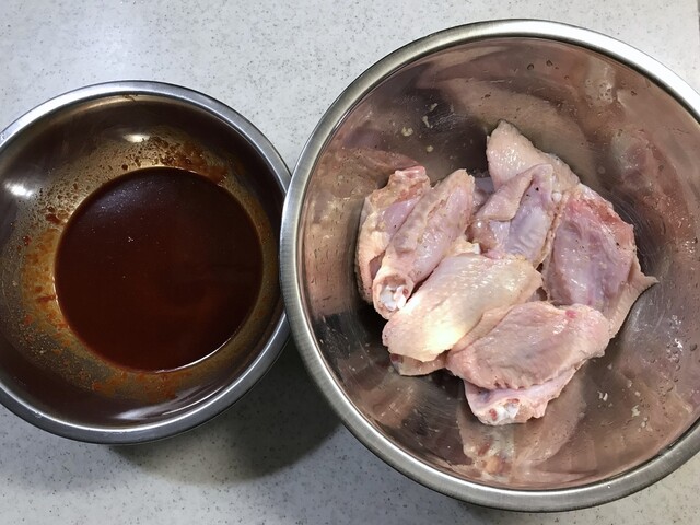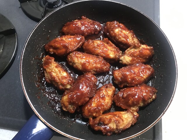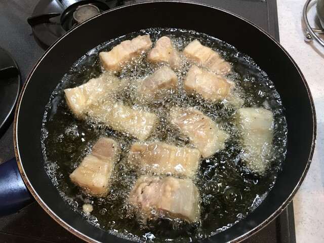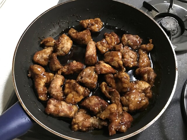フライパンでカリッと揚げた豚肉と調味料を合わせます