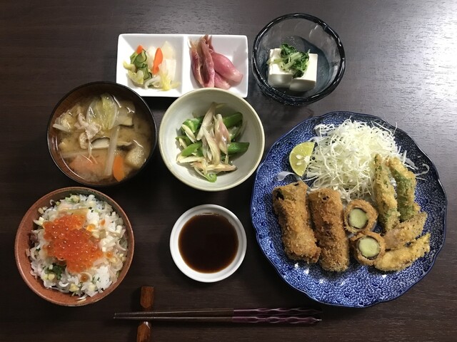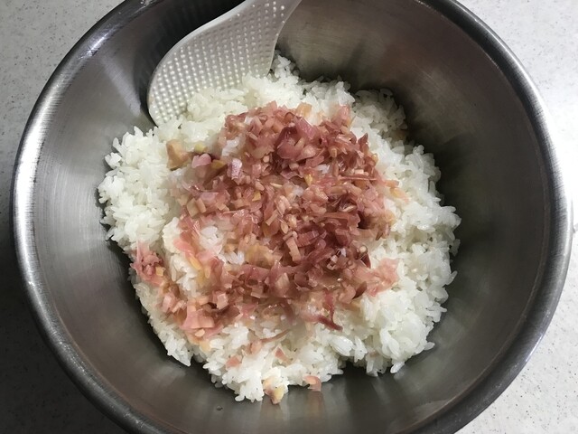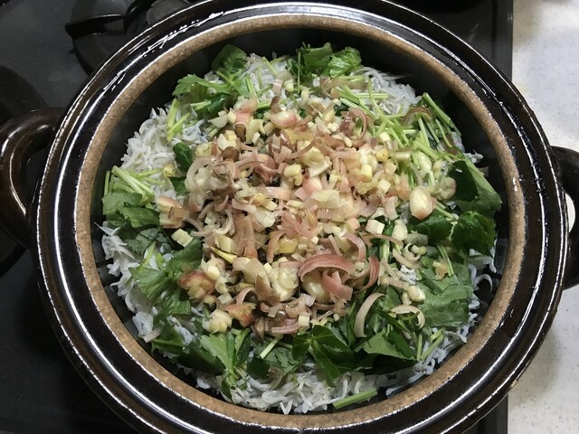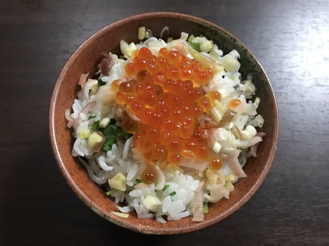 しらすと三つ葉の茗荷ご飯いくらのせ
