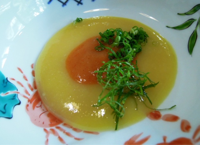目でも楽しませてくれ、有田焼の器に盛られたみずみずしい鯉のアライは、歯ごたえがとても良いですよ。