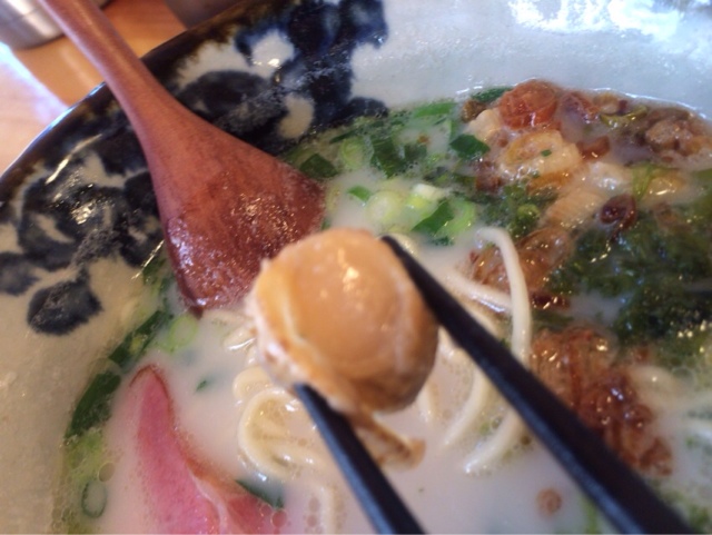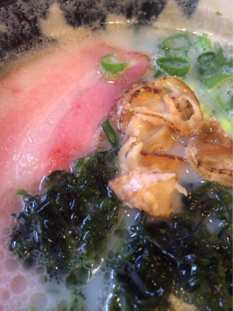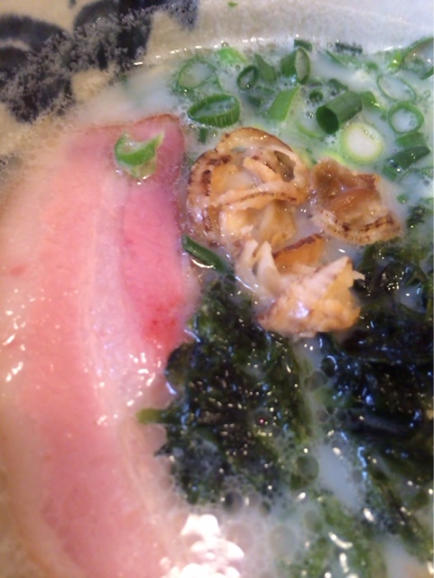 運ばれて来たラーメンは、乳白色のスープに、アオサ、ベーコン、焦がし白ネギ、ネギにベビーホタテ3個というトッピングです。