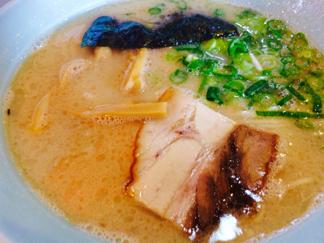 ラーメンには、チャーシュー、ネギ、メンマがトッピングされています。