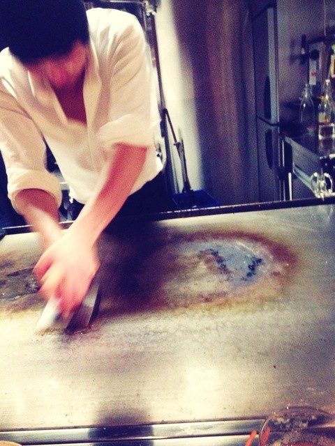 カウンターに座り、目の前の鉄板で焼いてくれる料理はどれもこれも美味し。