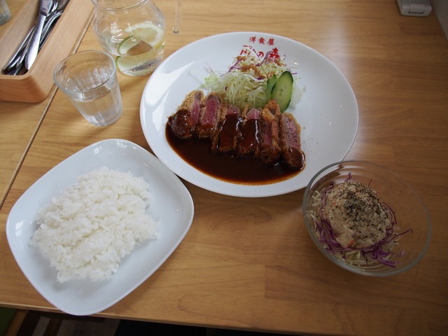 ハンバーグステーキは肉汁少なめですが、粗挽きで食感がしっかりしたタイプで、デミソースにも良く合います。ライスも固めでたべやすいです。+¥100でサラダも頼めることに、後から気がつきました。