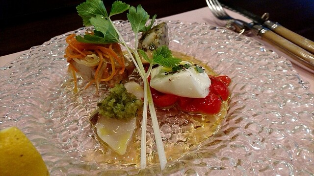 スズキのポアレにイベリコ豚のチョリソー等が盛合せてあります。