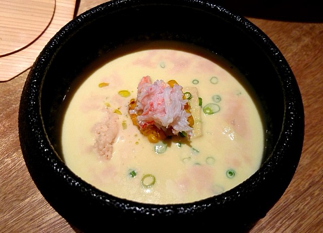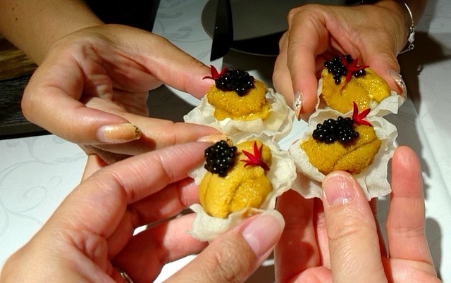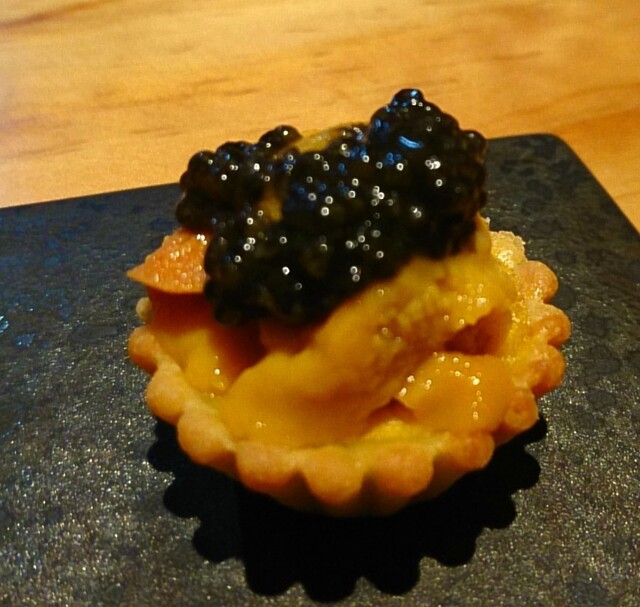 ●米粉チップにはだてのウニ、またその上にカスピ海キャビアにスーマントランチーズ