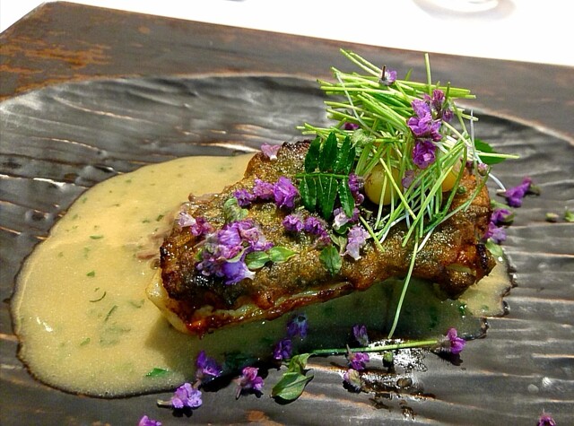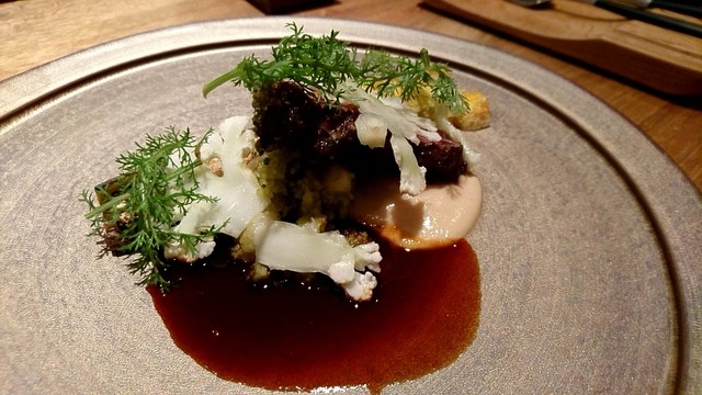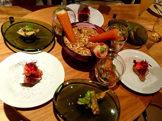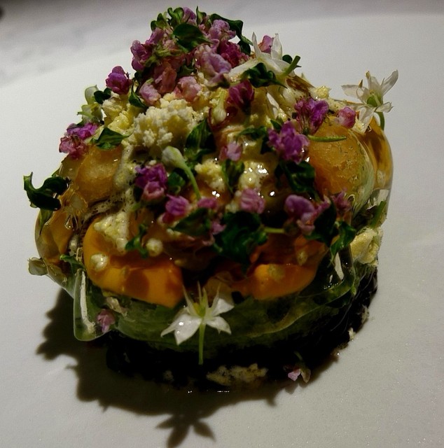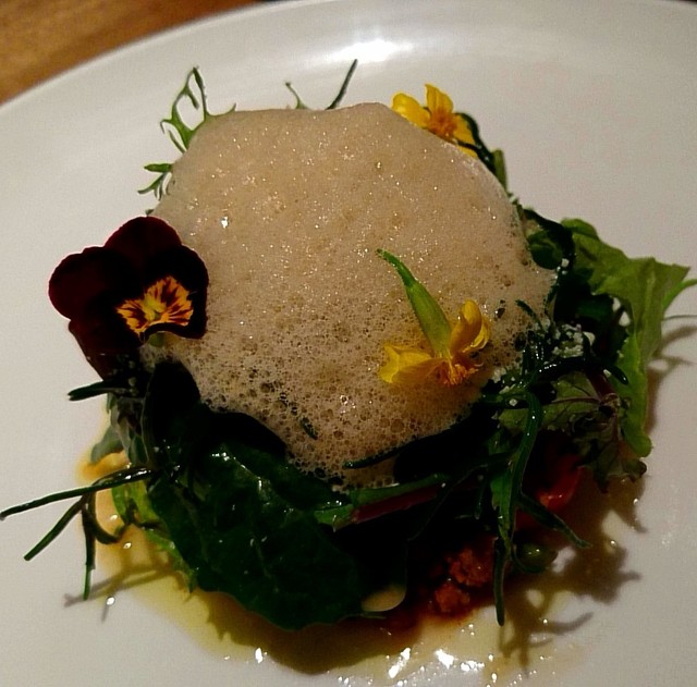 中にごぼうのフリットあり、下にホロホロ鳥のタルタル。アクセント ローズマリーオイル2.3滴