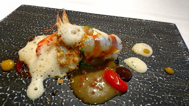 ●赤座エビのベニエに竹炭、柔白ねぎとプチセロリ。キュウリのソースの下にはクスクス