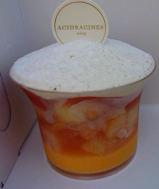 最初のシャンパーニュは白桃入り♪ シェフにより丁寧に濾された白桃が入った