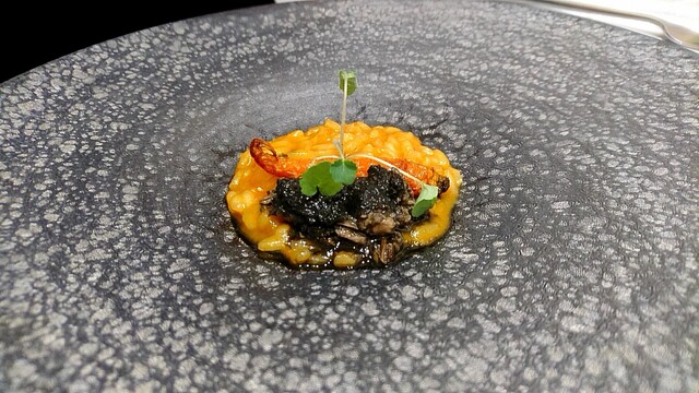 豚肩のイカスミ煮とミニニンジンのローストがトッピングされています。