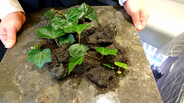 最初に驚いたのは、石器の上に青々としたアイビーと土が!土は竹炭のビニエのようです。