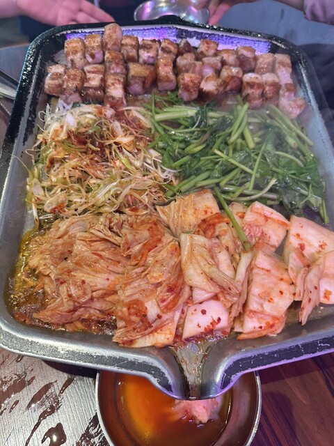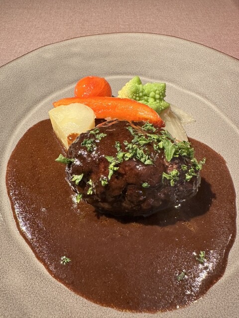 仕事帰りに女性一人で入店。入口が開いていたせいか、とても入りやすい雰囲気です。ハラミとハンバーグのコンボをミディアムで、ソースはにんにくとOZソースをオーダーしました。あつあつの鉄板がテンション上がり...