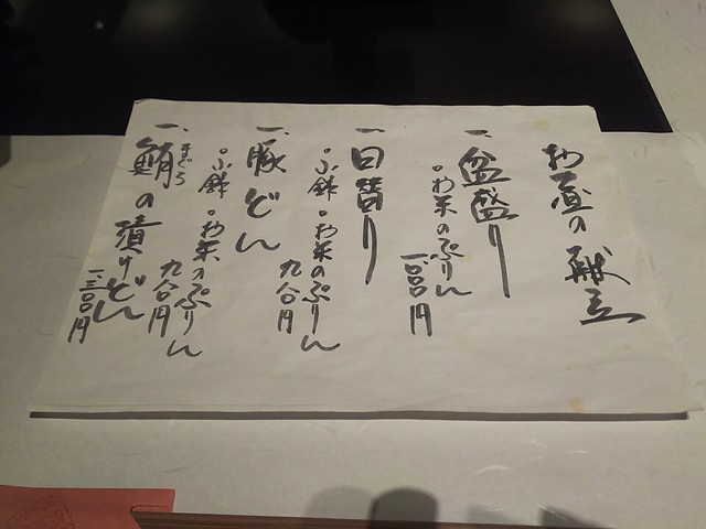 人気のお店なので相席もあるのかな?と思い座る場所の指定を待っていたら、『おすきなせきへどうぞ。』とのこと。メニューを渡され、『おちゃをよういしますね。』って障子を閉じられ、下がられたので、オーダーを保留…