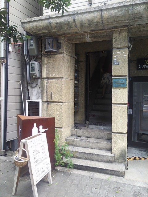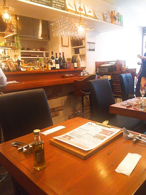 レトロビルのダコタハウス2階の小さなイタリア料理店です。分かり辛いですが、再訪なので迷わず到着、二階へ上り、ドアをオープン!予約を伝えてカウンターへご案内です。雰囲気もレトロ感でいいね。