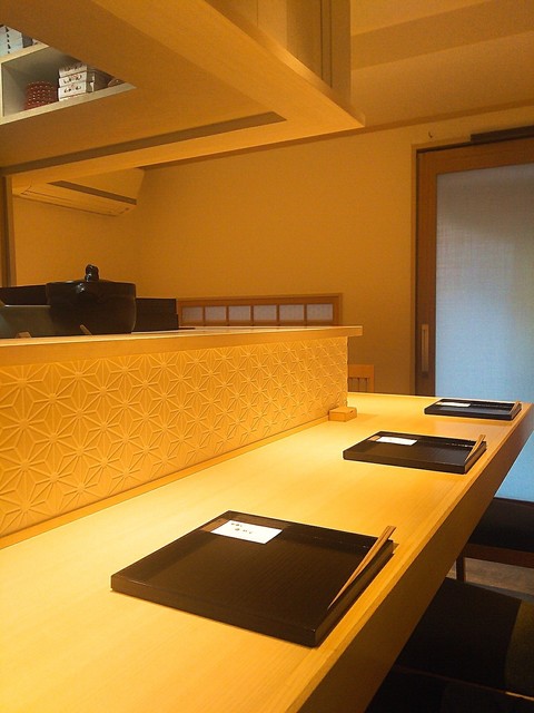 割烹の造りで落ち着きます。靴を脱いで上がってカウンターへ…床暖房のせいか足も暖かいです。お店の方の接客も丁寧で心地良い…。