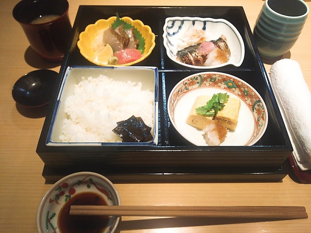 構成をかなり絞って、鯖の西京焼き、お刺身、出し巻き、白ごはん、昆布の漬物を松花堂弁当にして、しじみ汁を付けて、なんとか1,000円に収めた感じですね…