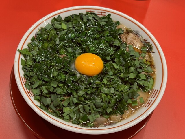 トッピングはこれでもかと言わんばかりのニラ、ニラ、ニラ、ニラ、ニラ、ニラ、ニラ、ニラ。最後にあつあつオイルをかけてニラの香りをブースト。