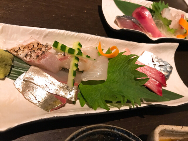 〆サバ・鰹・スズキ・鯛の焼き霜・シマアジの盛り合わせ…。やっぱり日本酒と言えばお造りやね。どれもしっかりと脂が乗っています♫ばくれん、ぐびぐびぐび・・・。