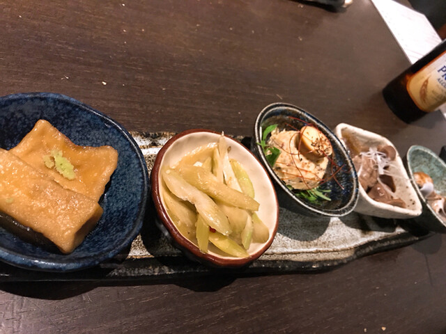 まずはおばんざい的なアテが綺麗に並べられて登場…。そうそう酒飲みはこんな感じで、少量多種をちょこちょこ食べたいんよね♫