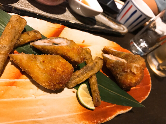鱧と梅肉は間違いのない組み合わせ!!個人的には衣の塩気がやや強い印象も受けましたが、添えられた牛蒡もカラッと揚げられていました。再びばくれん、ぐびぐびぐびぐびぐび・・・。
