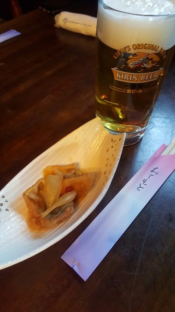 前回は昼間に来店、夜は人も少ないのてゆっくり食事でしました。おつまみ最高、前回はミックスフライ定食でしたが、初めて飲んでみました、妻は定食で、自分はビールとお通し、お通しも魚の南蛮漬け、ビールと合う、...