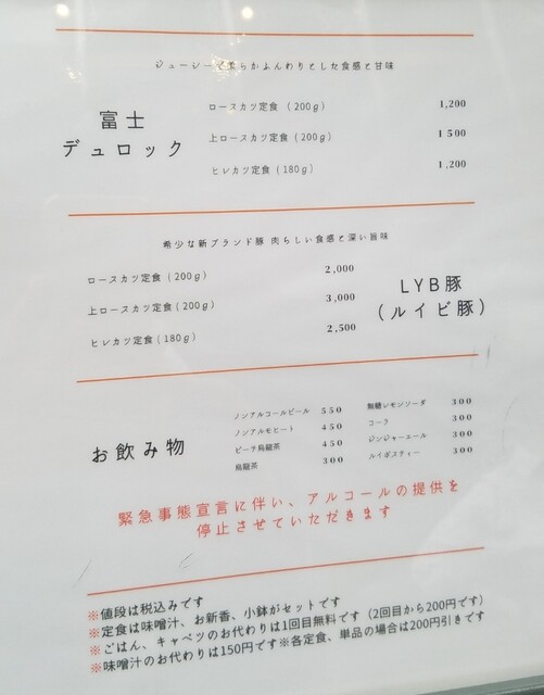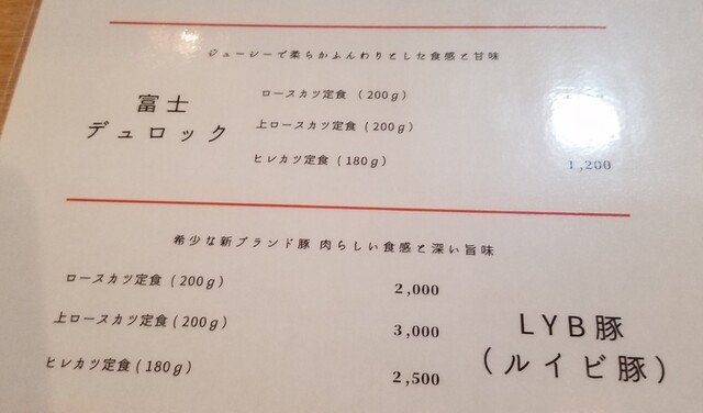 富士デュロックとLYB豚(ルイビ豚)の2種類の豚を使用しており、LYB豚の方が高級で普通のロースと上とヒレと値段が違う感じ❗㌘数はヒレが180㌘でロースは200㌘で上も一緒❗富士デュロックも一緒な感じです。