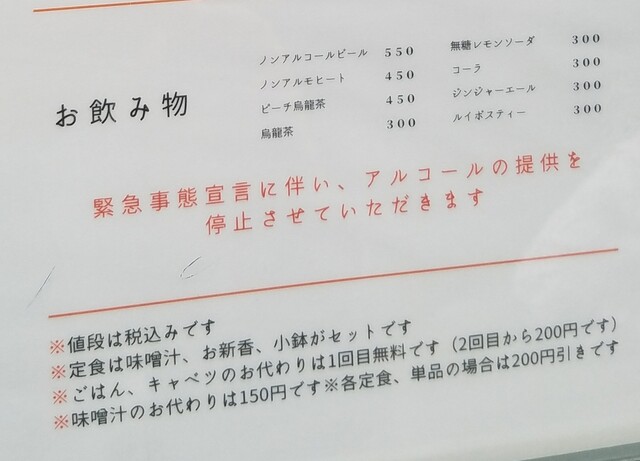 定食は、味噌汁(赤だし)、お新香、小鉢がセットでご飯、キャベツのおかわりは1回無料で2回目からは200円かかるそう。味噌汁のおかわりは150円だそうでとんかつ単品は200円引きだそう。